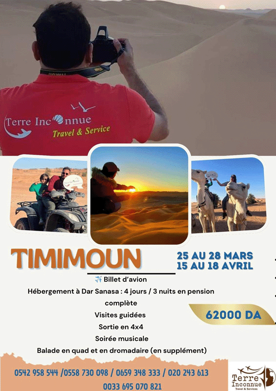 Les sejours du printemps 2026 avec Terre inconnue Taghit (du 25 au 28 mars) et Timimoun (du 25 au 28 mars) (du 15 au 18 avril)